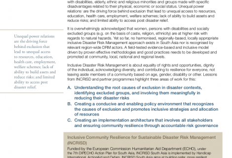 This paper argues the case for building safer, more resilient communities in South Asia using evidence-based inclusive approaches to Disaster Risk Management (DRM) through multi-stakeholder engagement. It is based on the learning from the Inclusive Community Resilience for Sustainable Disaster Risk Management (INCRISD) South Asia project, currently being implemented in Afghanistan, Bangladesh, India, Nepal, Pakistan and Sri Lanka by ActionAid, Handicap International and Oxfam with support from European Commission Humanitarian Aid Department (ECHO), under the 7th DIPECHO Action Plan for South Asia. While this paper is based on South Asia experiences, recommendations and approaches are meant to have a universal application.